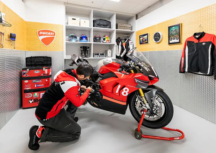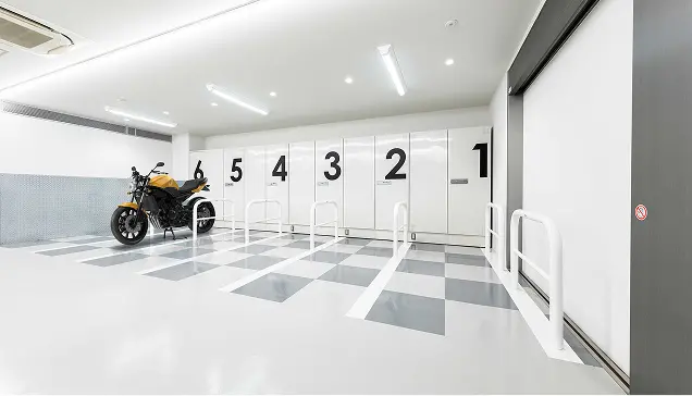 ガレージタイプのバイクパーキングには、電源コンセント・有孔ボード・収納棚・ロッカーなどが設置されており、簡易的な作業は可能です。ただし、基本的には保管専用スペースのため、整備や洗車などの作業は制限される場合があります。